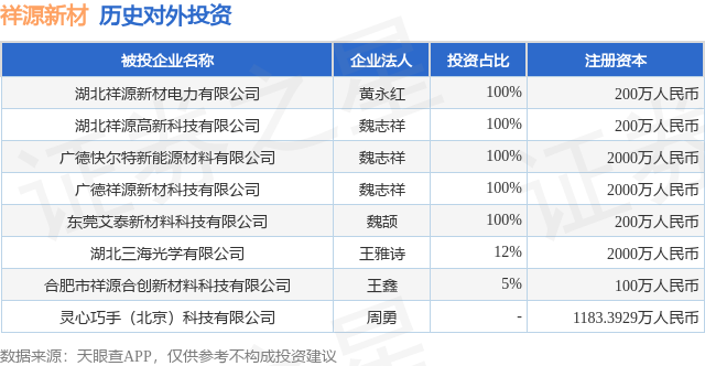 通过天眼查大数据分析,湖北祥源新材科技股份有限公司共对外投资了9家企业,参与招投标项目19次;财产线索方面有商标信息23条,专利信息94条;此外企业还拥有行政许可44个。