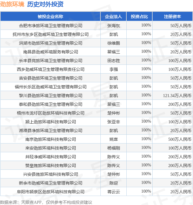 证券之星消息,根据天眼查APP显示,劲旅环境(001230.SZ)新增一起对外投资事件,被投资公司为韩城旌旅环境卫生有限公司,法定代表人李强,投资占比为80%。该公司从事公共设施管理业,注册资本为50万人民币。目前,劲旅环境共存在对外投资113项,投资占比前20的项目见下表: