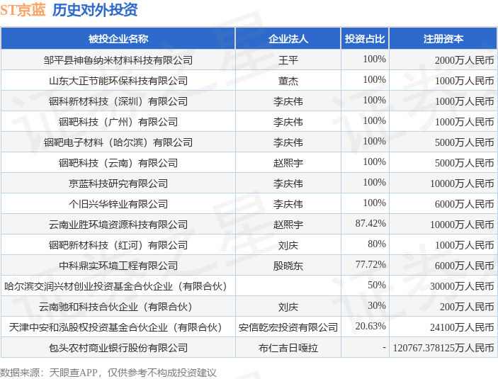 证券之星消息,根据天眼查APP显示,ST京蓝(000711.SZ)新增一起对外投资事件,被投资公司为铟靶新材科技(红河)有限公司,法定代表人刘庆,投资占比为80%。该公司从事科技推广和应用服务业,注册资本为1000万人民币。目前,ST京蓝共存在对外投资15项,详见下表: