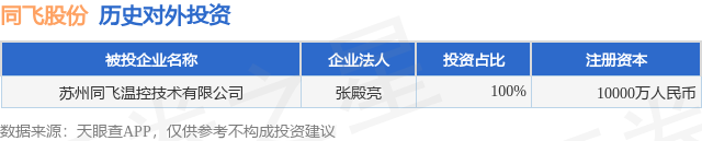 证券之星消息,根据天眼查APP显示,同飞股份(300990.SZ)新增一起对外投资事件,被投资公司为苏州同飞温控技术有限公司,法定代表人张殿亮,投资占比为100%。该公司从事计算机、通信和其他电子设备制造业,注册资本为10000万人民币。目前,同飞股份共存在对外投资1项,详见下表: