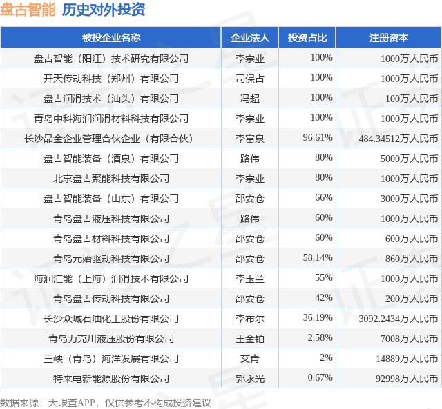 通过天眼查大数据分析,青岛盘古智能制造股份有限公司共对外投资了20家企业,参与招投标项目173次;财产线索方面有商标信息6条,专利信息118条,著作权信息11条;此外企业还拥有行政许可16个。据2024年报数据,盘古智能长期股权投资6400.55万元。