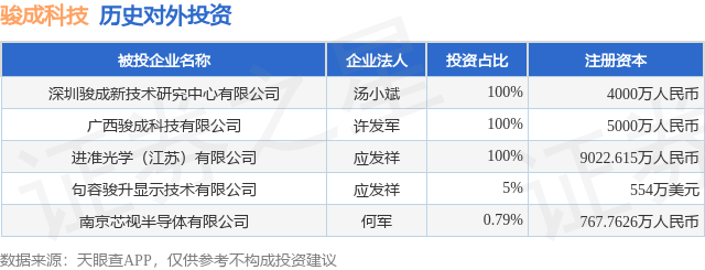 证券之星消息,根据天眼查APP显示,骏成科技(301106.SZ)新增一起对外投资事件,被投资公司为南京芯视半导体有限公司,法定代表人何军,投资占比为0.79%。该公司从事科技推广和应用服务业,注册资本为767.7626万人民币。目前,骏成科技共存在对外投资5项,详见下表: