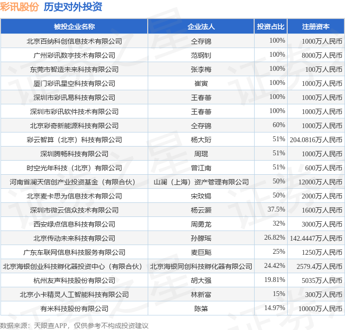 证券之星消息,根据天眼查APP显示,彩讯股份(300634.SZ)新增一起对外投资事件,被投资公司为共青城恒融一期创业投资合伙企业(有限合伙),法定代表人北京允泰投资管理有限公司,投资占比为5.18%。该公司从事资本市场服务,注册资本为9650万人民币。目前,彩讯股份共存在对外投资27项,投资占比前20的项目见下表: