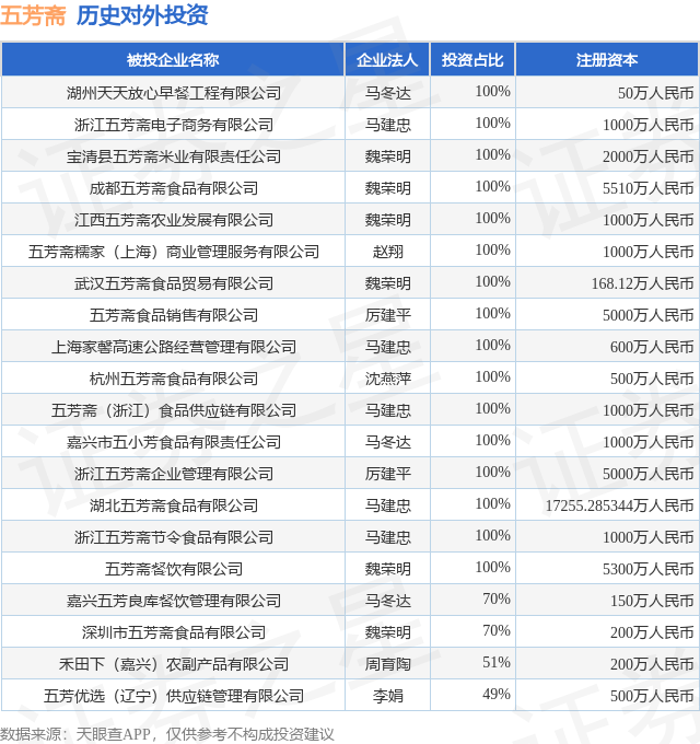 证券之星消息,根据天眼查APP显示,五芳斋(603237.SH)新增一起对外投资事件,被投资公司为五芳优选(辽宁)供应链管理有限公司,法定代表人李娟,投资占比为49%。该公司从事批发业,注册资本为500万人民币。目前,五芳斋共存在对外投资21项,投资占比前20的项目见下表: