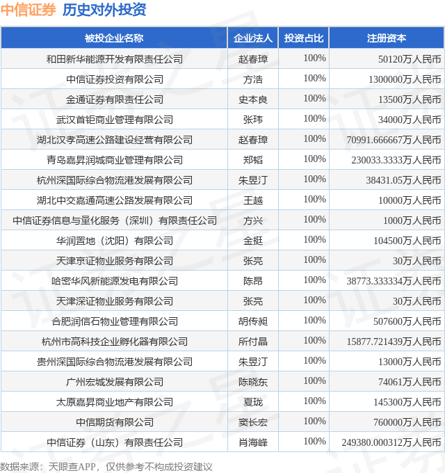 证券之星消息,根据天眼查APP显示,中信证券(600030.SH)新增一起对外投资事件,被投资公司为和田新华能源开发有限责任公司,法定代表人赵春璋,投资占比为100%。该公司从事电力、热力生产和供应业,注册资本为50120万人民币。目前,中信证券共存在对外投资314项,投资占比前20的项目见下表: