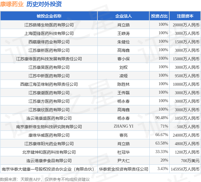 通过天眼查大数据分析,江苏康缘药业股份有限公司共对外投资了18家企业,参与招投标项目7259次;财产线索方面有商标信息463条,专利信息1062条,著作权信息42条;此外企业还拥有行政许可688个。据2024年报数据,康缘药业商誉5898.89万元,同比未变化。长期股权投资412.66万元,同比增0.43%。