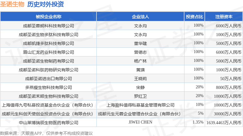 证券之星消息,根据天眼查APP显示,圣诺生物(688117.SH)新增一起对外投资事件,被投资公司为上海值得九号私募投资基金合伙企业(有限合伙),法定代表人上海盈科值得私募基金管理有限公司,投资占比为10%。该公司从事资本市场服务,注册资本为10000万人民币。目前,圣诺生物共存在对外投资12项,详见下表: