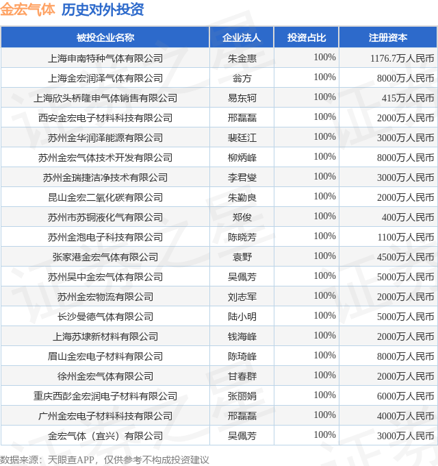 通过天眼查大数据分析,金宏气体股份有限公司共对外投资了69家企业,参与招投标项目206次;财产线索方面有商标信息150条,专利信息525条,著作权信息5条;此外企业还拥有行政许可741个。据2024年报数据,金宏气体商誉2.98亿元,同比减9.6%。