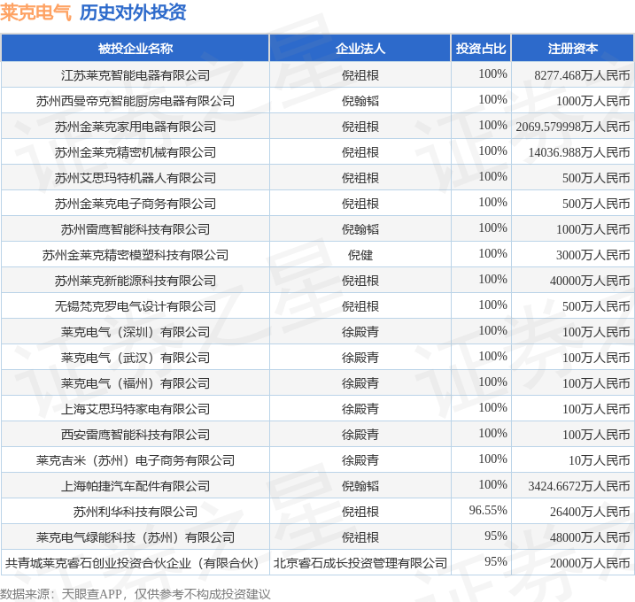 证券之星消息,根据天眼查APP显示,莱克电气(603355.SH)新增一起对外投资事件,被投资公司为共青城莱克睿石创业投资合伙企业(有限合伙),法定代表人北京睿石成长投资管理有限公司,投资占比为95%。该公司从事商务服务业,注册资本为20000万人民币。目前,莱克电气共存在对外投资22项,投资占比前20的项目见下表: