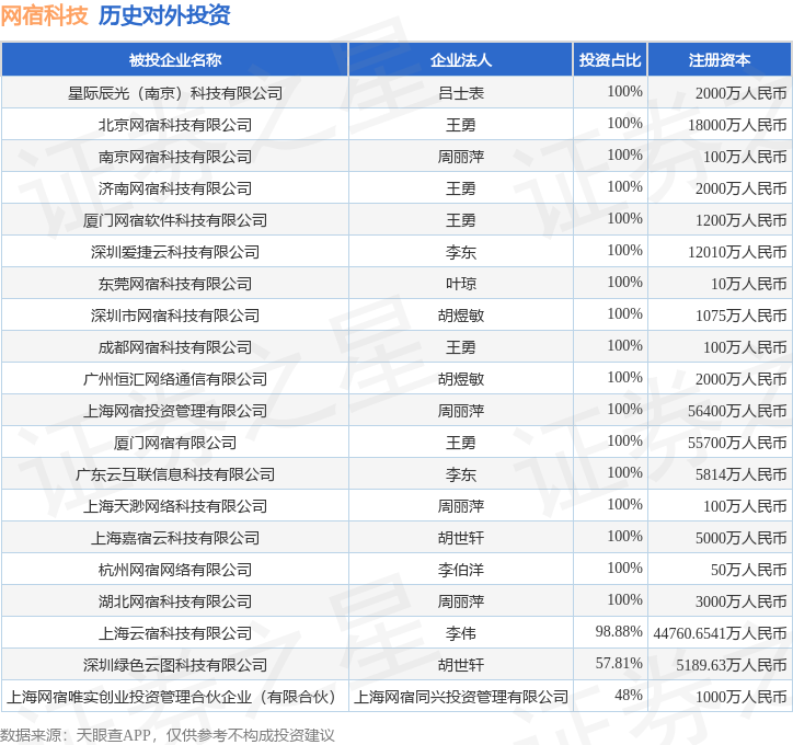证券之星消息,根据天眼查APP显示,网宿科技(300017.SZ)新增一起对外投资事件,被投资公司为星际辰光(南京)科技有限公司,法定代表人吕士表,投资占比为100%。该公司从事科技推广和应用服务业,注册资本为2000万人民币。目前,网宿科技共存在对外投资24项,投资占比前20的项目见下表: