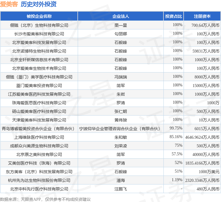 证券之星消息,根据天眼查APP显示,爱美客(300896.SZ)新增一起对外投资事件,被投资公司为俪臻(北京)生物科技有限公司,法定代表人栗一星,投资占比为100%。该公司从事科技推广和应用服务业,注册资本为700.64万人民币。目前,爱美客共存在对外投资21项,投资占比前20的项目见下表: