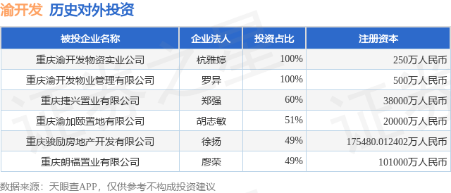 证券之星消息,根据天眼查APP显示,渝开发(000514.SZ)新增一起对外投资事件,被投资公司为重庆渝开发物资实业公司,法定代表人杭雅婷,投资占比为100%。该公司从事批发业,注册资本为250万人民币。目前,渝开发共存在对外投资6项,详见下表: