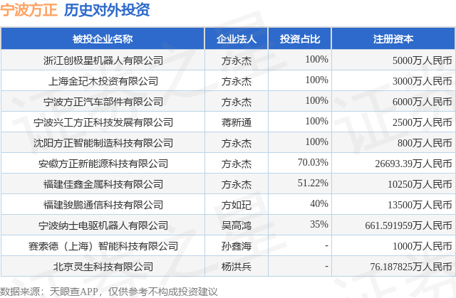 证券之星消息,根据天眼查APP显示,宁波方正(300998.SZ)新增一起对外投资事件,被投资公司为赛索德(上海)智能科技有限公司,法定代表人孙鑫海,投资占比为-。该公司从事研究和试验发展,注册资本为1000万人民币。目前,宁波方正共存在对外投资11项,详见下表: