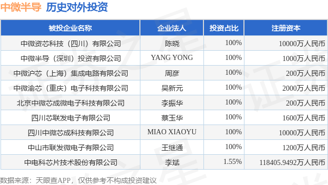 证券之星消息,根据天眼查APP显示,中微半导(688380.SH)新增一起对外投资事件,被投资公司为中微资芯科技(四川)有限公司,法定代表人陈晓,投资占比为100%。该公司从事计算机、通信和其他电子设备制造业,注册资本为10000万人民币。目前,中微半导共存在对外投资9项,详见下表: