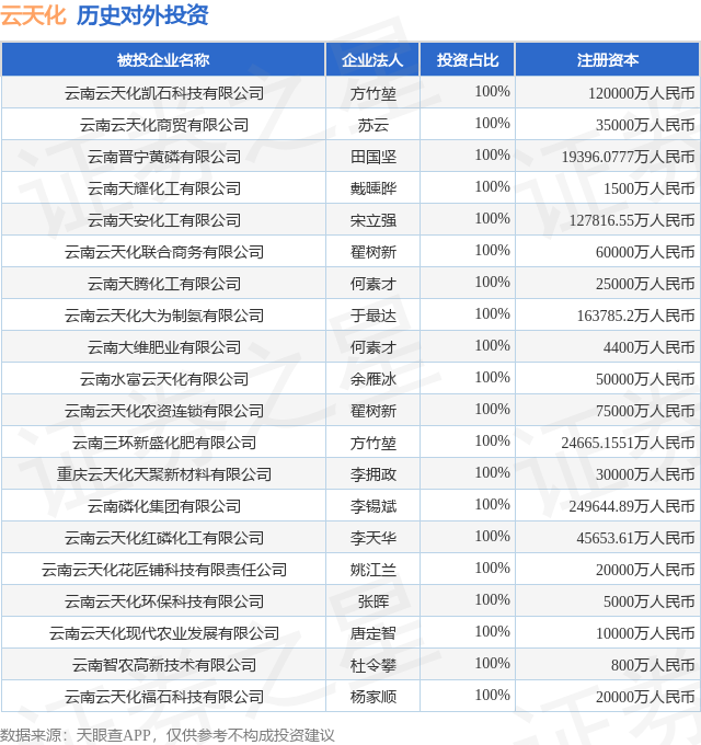 证券之星消息,根据天眼查APP显示,云天化(600096.SH)新增一起对外投资事件,被投资公司为云南云天化凯石科技有限公司,法定代表人方竹堃,投资占比为100%。该公司从事研究和试验发展,注册资本为120000万人民币。目前,云天化共存在对外投资50项,投资占比前20的项目见下表: