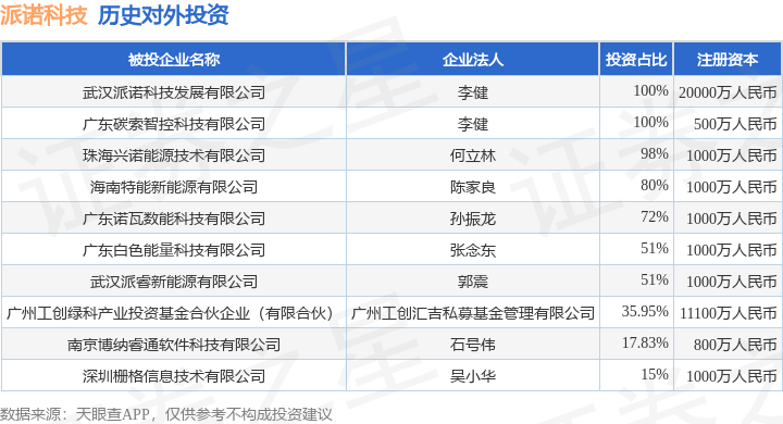 证券之星消息,根据天眼查APP显示,派诺科技(920375.BJ)新增一起对外投资事件,被投资公司为海南特能新能源有限公司,法定代表人陈家良,投资占比为80%。该公司从事电力、热力生产和供应业,注册资本为1000万人民币。目前,派诺科技共存在对外投资10项,详见下表: