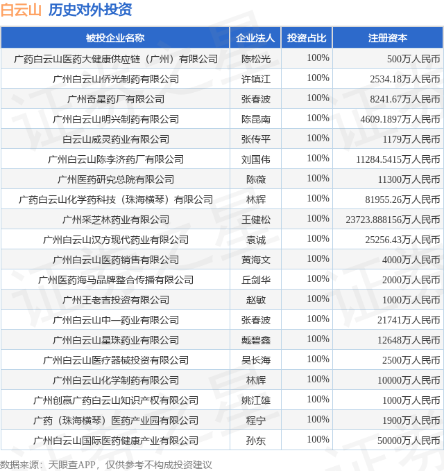 证券之星消息,根据天眼查APP显示,白云山(600332.SH)新增一起对外投资事件,被投资公司为广州医药数智科技有限公司,法定代表人,投资占比为60%。该公司从事科技推广和应用服务业,注册资本为3000万人民币。目前,白云山共存在对外投资58项,投资占比前20的项目见下表:
