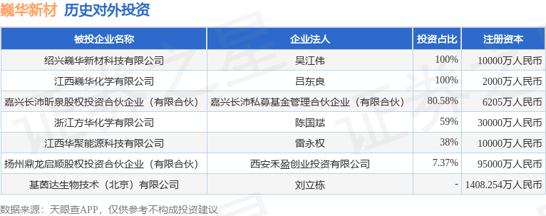 通过天眼查大数据分析,浙江巍华新材料股份有限公司共对外投资了7家企业,参与招投标项目21次;财产线索方面有商标信息4条,专利信息38条;此外企业还拥有行政许可43个。据2024年报数据,巍华新材长期股权投资3248.51万元,同比减6.23%。