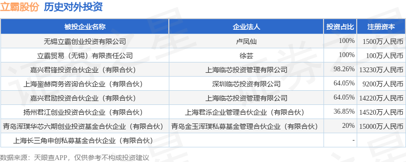 证券之星消息,根据天眼查APP显示,立霸股份(603519.SH)新增一起对外投资事件,被投资公司为扬州君江创业投资合伙企业(有限合伙),法定代表人上海君泺企业管理合伙企业(有限合伙),投资占比为36.85%。该公司从事商务服务业,注册资本为14520万人民币。目前,立霸股份共存在对外投资8项,详见下表:
