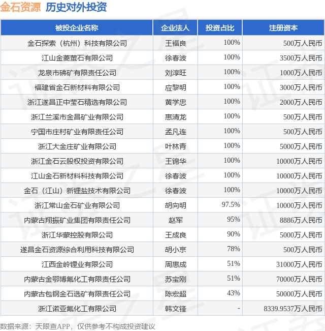 证券之星消息,根据天眼查APP显示,金石资源(603505.SH)新增一起对外投资事件,被投资公司为浙江诺亚氟化工有限公司,法定代表人韩文锋,投资占比为-。该公司从事化学原料和化学制品制造业,注册资本为8339.9537万人民币。目前,金石资源共存在对外投资19项,详见下表:
