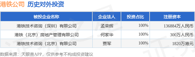 证券之星消息,根据天眼查APP显示,港铁公司(00066.HK)新增一起对外投资事件,被投资公司为港铁技术咨询(深圳)有限公司,法定代表人孟荣辉,投资占比为100%。该公司从事专业技术服务业,注册资本为136884万人民币。目前,港铁公司共存在对外投资3项,详见下表: