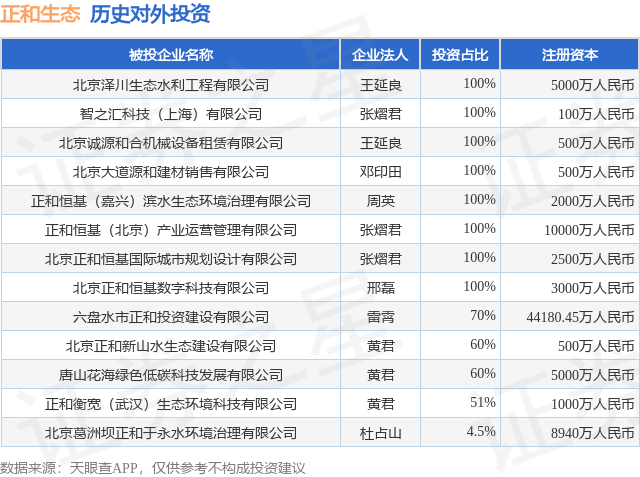 证券之星消息,根据天眼查APP显示,正和生态(605069.SH)新增一起对外投资事件,被投资公司为北京泽川生态水利工程有限公司,法定代表人王延良,投资占比为100%。该公司从事房屋建筑业,注册资本为5000万人民币。目前,正和生态共存在对外投资13项,详见下表: