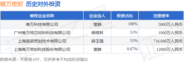 证券之星消息,根据天眼查APP显示,唯万密封(301161.SZ)新增一起对外投资事件,被投资公司为广州唯万特芯材料科技有限公司,法定代表人杨榕林,投资占比为51%。该公司从事橡胶和塑料制品业,注册资本为1000万人民币。目前,唯万密封共存在对外投资4项,详见下表: