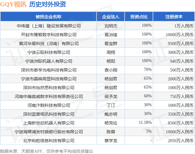 证券之星消息,根据天眼查APP显示,GQY视讯(300076.SZ)新增一起对外投资事件,被投资公司为宁波市晶映商显科技有限公司,法定代表人杨剑君,投资占比为65%。该公司从事计算机、通信和其他电子设备制造业,注册资本为2000万人民币。目前,GQY视讯共存在对外投资14项,详见下表: