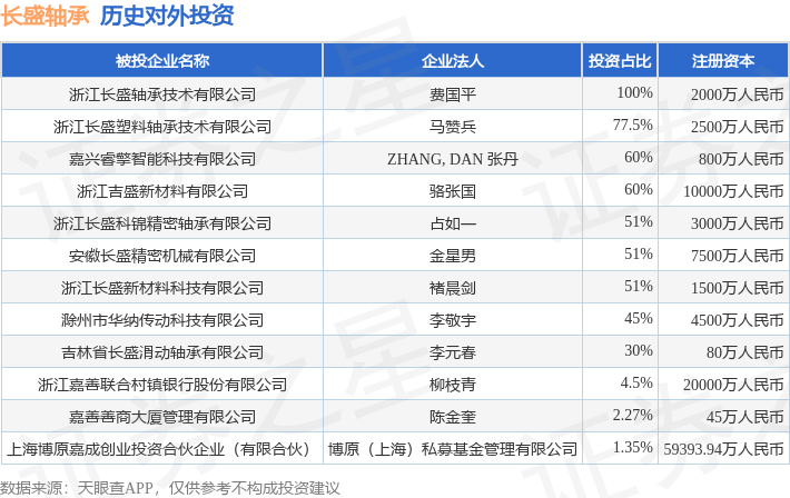 证券之星消息,根据天眼查APP显示,长盛轴承(300718.SZ)新增一起对外投资事件,被投资公司为浙江长盛科锦精密轴承有限公司,法定代表人占如一,投资占比为51%。该公司从事通用设备制造业,注册资本为3000万人民币。目前,长盛轴承共存在对外投资12项,详见下表:
