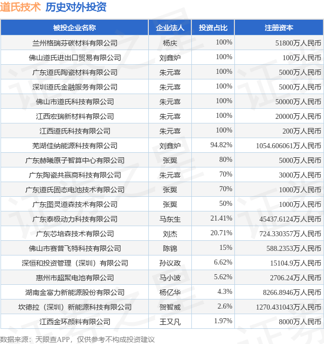 证券之星消息,根据天眼查APP显示,道氏技术(300409.SZ)新增一起对外投资事件,被投资公司为坎德拉(深圳)新能源科技有限公司,法定代表人贺智威,投资占比为2.6%。该公司从事电气机械和器材制造业,注册资本为1270.431043万人民币。目前,道氏技术共存在对外投资21项,投资占比前20的项目见下表: