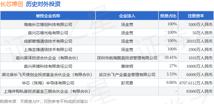 证券之星消息,根据天眼查APP显示,长芯博创(300548.SZ)新增一起对外投资事件,被投资公司为上海并购私募投资基金三期合伙企业(有限合伙),法定代表人,投资占比为-。该公司从事资本市场服务,注册资本为83000万人民币。目前,长芯博创共存在对外投资9项,详见下表: