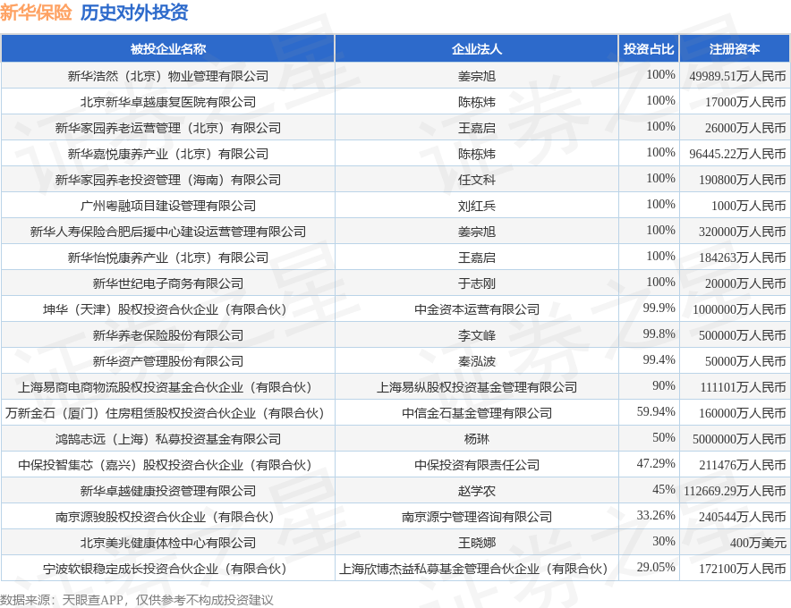 通过天眼查大数据分析,新华人寿保险股份有限公司共对外投资了56家企业,参与招投标项目2393次;财产线索方面有商标信息66条,专利信息2条,著作权信息36条;此外企业还拥有行政许可85个。据2024年报数据,新华保险长期股权投资302.45亿元,同比增484.56%。