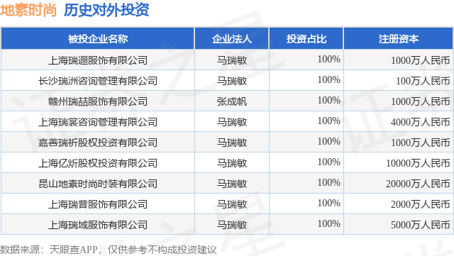证券之星消息,根据天眼查APP显示,地素时尚(603587.SH)新增一起对外投资事件,被投资公司为上海瑞逦服饰有限公司,法定代表人马瑞敏,投资占比为100%。该公司从事批发业,注册资本为1000万人民币。目前,地素时尚共存在对外投资9项,详见下表:
