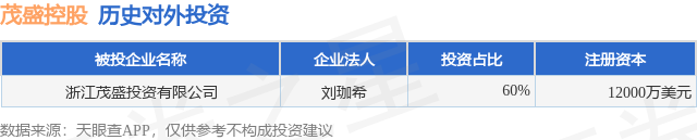 通过天眼查大数据分析,茂盛控股有限公司共对外投资了1家企业。