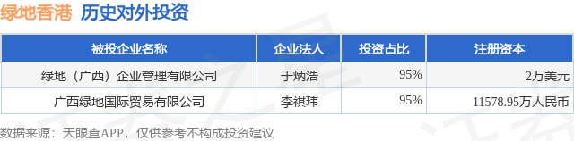 证券之星消息,根据天眼查APP显示,绿地香港(00337.HK)新增一起对外投资事件,被投资公司为绿地(广西)企业管理有限公司,法定代表人于炳浩,投资占比为95%。该公司从事商务服务业,注册资本为2万美元。目前,绿地香港共存在对外投资2项,详见下表: