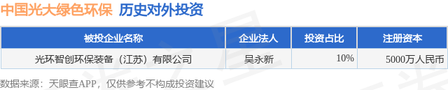 证券之星消息,根据天眼查APP显示,中国光大绿色环保(01257.HK)新增一起对外投资事件,被投资公司为光环智创环保装备(江苏)有限公司,法定代表人吴永新,投资占比为10%。该公司从事研究和试验发展,注册资本为5000万人民币。目前,中国光大绿色环保共存在对外投资1项,详见下表: