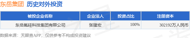 证券之星消息,根据天眼查APP显示,东岳集团(00189.HK)新增一起对外投资事件,被投资公司为东岳氟硅科技集团有限公司,法定代表人张建宏,投资占比为100%。该公司从事通用设备制造业,注册资本为302192万人民币。目前,东岳集团共存在对外投资1项,详见下表:
