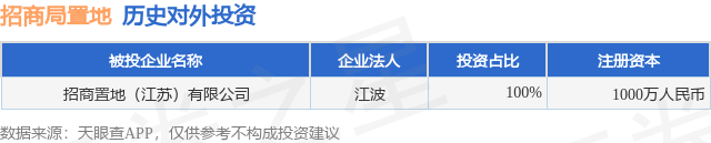证券之星消息,根据天眼查APP显示,招商局置地(00978.HK)新增一起对外投资事件,被投资公司为招商置地(江苏)有限公司,法定代表人江波,投资占比为100%。该公司从事房地产业,注册资本为1000万人民币。目前,招商局置地共存在对外投资1项,详见下表: