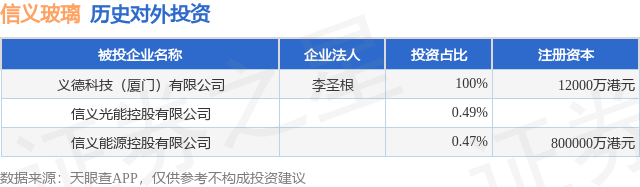证券之星消息,根据天眼查APP显示,信义玻璃(00868.HK)新增一起对外投资事件,被投资公司为义德科技(厦门)有限公司,法定代表人李圣根,投资占比为100%。该公司从事研究和试验发展,注册资本为12000万港元。目前,信义玻璃共存在对外投资3项,详见下表: