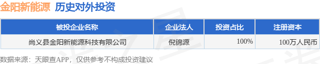 证券之星消息,根据天眼查APP显示,金阳新能源(01121.HK)新增一起对外投资事件,被投资公司为尚义县金阳新能源科技有限公司,法定代表人倪锦源,投资占比为100%。该公司从事科技推广和应用服务业,注册资本为100万人民币。目前,金阳新能源共存在对外投资1项,详见下表:
