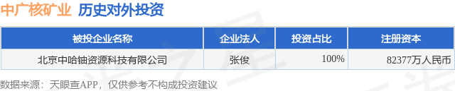 证券之星消息,根据天眼查APP显示,中广核矿业(01164.HK)新增一起对外投资事件,被投资公司为北京中哈铀资源科技有限公司,法定代表人张俊,投资占比为100%。该公司从事商务服务业,注册资本为82377万人民币。目前,中广核矿业共存在对外投资1项,详见下表: