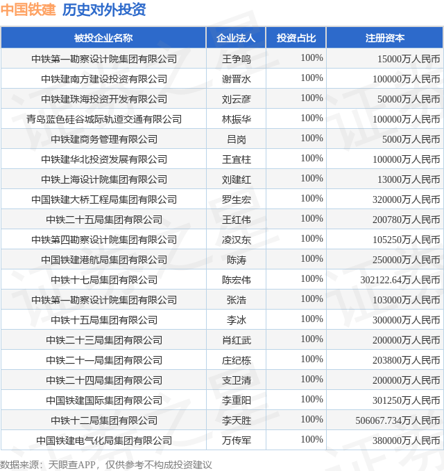 证券之星消息,根据天眼查APP显示,中国铁建(601186.SH)新增一起对外投资事件,被投资公司为中铁第一勘察设计院集团有限公司,法定代表人王争鸣,投资占比为100%。该公司从事专业技术服务业,注册资本为15000万人民币。目前,中国铁建共存在对外投资125项,投资占比前20的项目见下表: