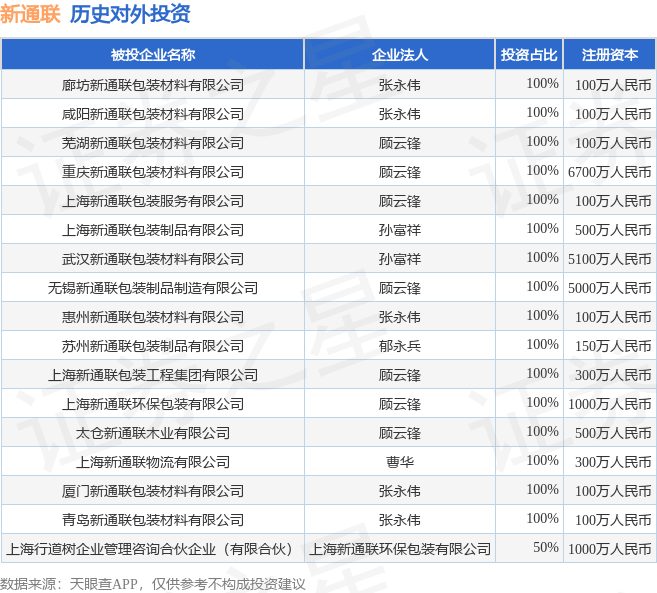 证券之星消息,根据天眼查APP显示,新通联(603022.SH)新增一起对外投资事件,被投资公司为廊坊新通联包装材料有限公司,法定代表人张永伟,投资占比为100%。该公司从事造纸和纸制品业,注册资本为100万人民币。目前,新通联共存在对外投资17项,详见下表: