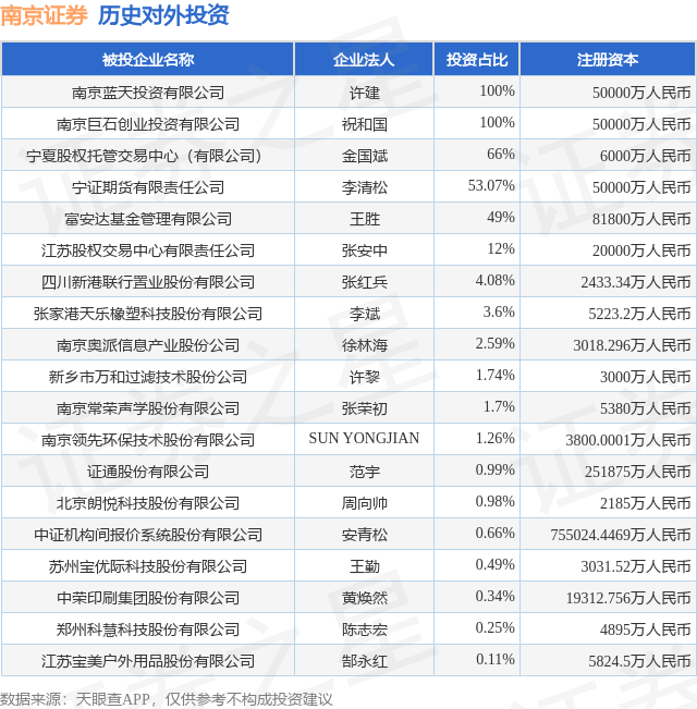 证券之星消息,根据天眼查APP显示,南京证券(601990.SH)新增一起对外投资事件,被投资公司为中荣印刷集团股份有限公司,法定代表人黄焕然,投资占比为0.34%。该公司从事印刷和记录媒介复制业,注册资本为19312.756万人民币。目前,南京证券共存在对外投资19项,详见下表:
