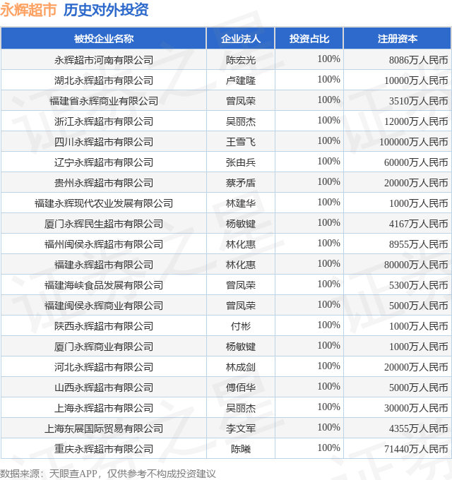 通过天眼查大数据分析,永辉超市股份有限公司共对外投资了84家企业,参与招投标项目975次;财产线索方面有商标信息2609条,著作权信息12条;此外企业还拥有行政许可23个。据2025年报数据,永辉超市长期股权投资21.32亿元,同比减11.16%。
