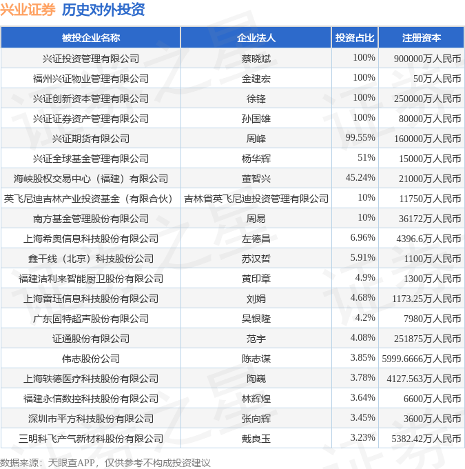 通过天眼查大数据分析,兴业证券股份有限公司共对外投资了59家企业,参与招投标项目2807次;财产线索方面有商标信息173条,专利信息37条,著作权信息62条;此外企业还拥有行政许可32个。据2025年报数据,兴业证券商誉1226.41万元,同比未变化。长期股权投资15.94亿元,同比减12.1%。