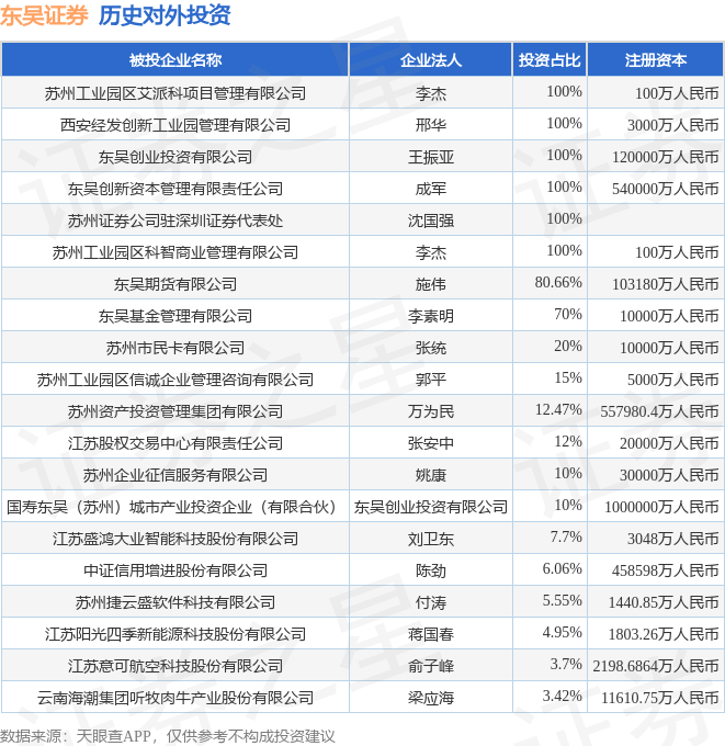 通过天眼查大数据分析,东吴证券股份有限公司共对外投资了41家企业,参与招投标项目855次;财产线索方面有商标信息39条,专利信息12条,著作权信息49条;此外企业还拥有行政许可16个。据2024年报数据,东吴证券商誉3.29亿元,同比增1.2%。长期股权投资22.25亿元,同比增0.68%。