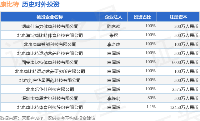 证券之星消息,根据天眼查APP显示,康比特(920429.BJ)新增一起对外投资事件,被投资公司为湖南佳满力健康科技有限公司,法定代表人陈家豪,投资占比为100%。该公司从事科技推广和应用服务业,注册资本为200万人民币。目前,康比特共存在对外投资10项,详见下表: