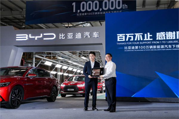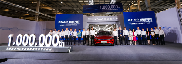 5月19日,比亚迪第100万辆新能源汽车正式下线仪式,成为首个进入新能源汽车“百万辆俱乐部”的中国品牌。政府行业主管部门、行业协会的有关领导,比亚迪的供应商伙伴代表、400家媒体及比亚迪近百位车主代表在仪式现场,一同见证。