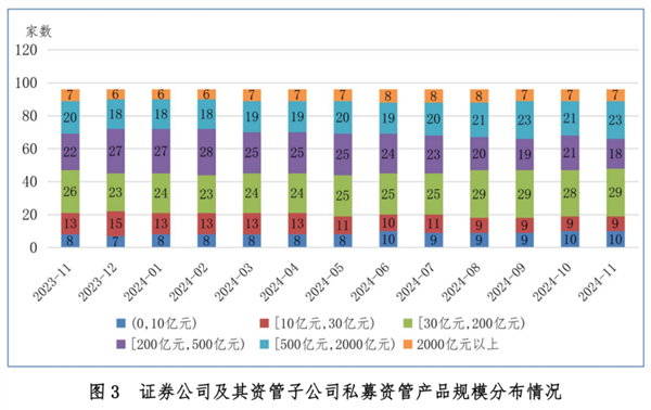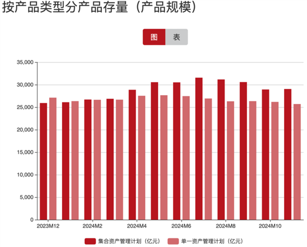 2024年,券商私募资管的规模及数量,保持着增长趋势。中基协最新数据显示,截至2024年11月底,证券公司及其资管子公司的存续私募产品规模为5.47万亿元,产品数量为19868只,相比2023年底的5.3万亿元、18752只,增幅分别为3.19%和5.95%。